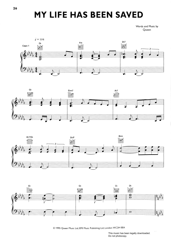 My Life Has Been Saved Klavier Gesang Gitarre Pdf Noten Von Queen In Des Dur Fbd 35270